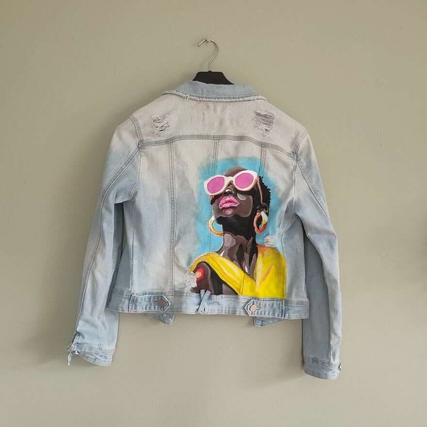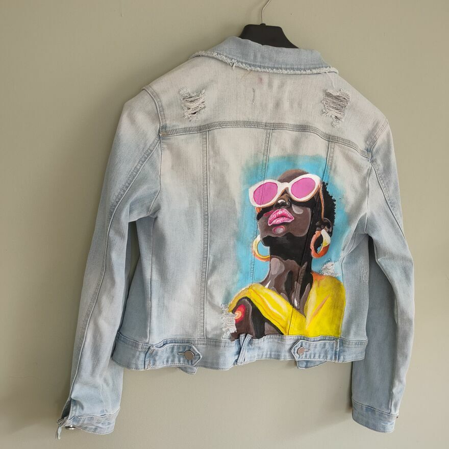 Unikatowa kurtka jeansowa handmadeRęcznie malowana kurtka jeansowa w jasnym odcieniu denimu, stworzona z pasją i dbałością o każdy detal