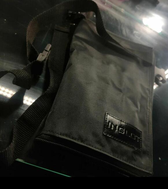 Torebka na szerokim pasku, pasek do regulacji. Torebka składa się z dwóch torebek. Wymiary większej ...